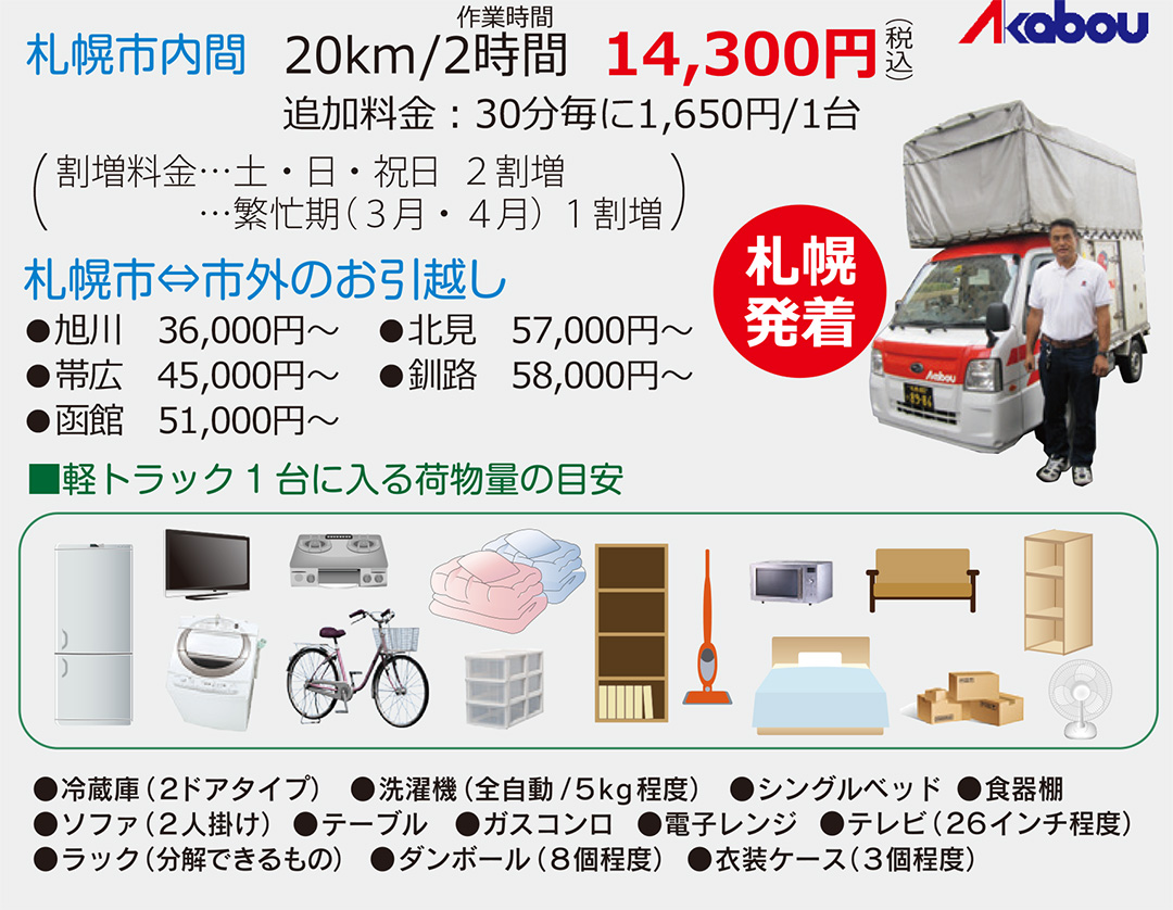 | 定山渓・銭函・当別町・恵庭市のお引越し | 1台当たり90分 9,900円(税込) 追加料金:30分ごとに3,300円/1台 |